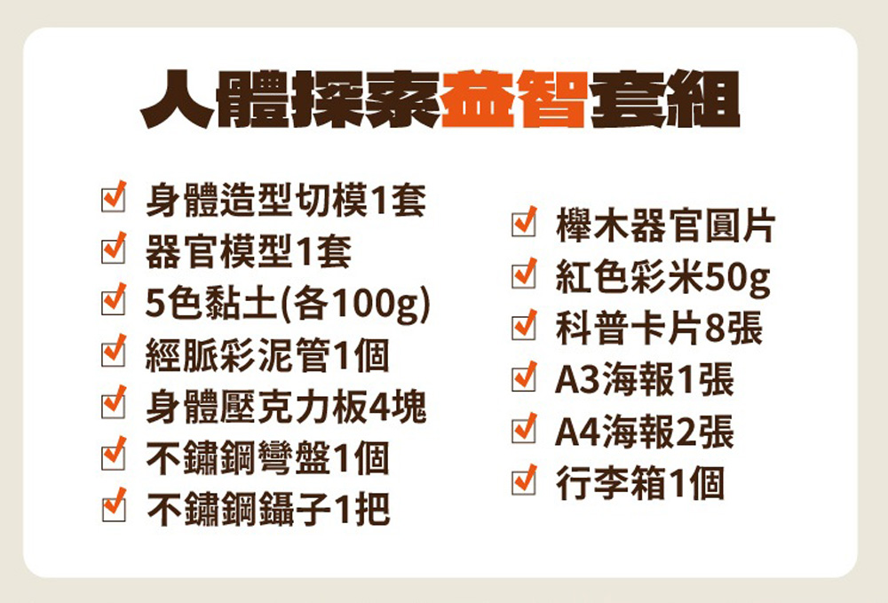 ▼【兒童STEAM探索系列-iPOFF&HRC人體探索益智套組】大全套內附13樣人體教學材料及工具,內容物有『迷你手提行李箱1個、身體壓克力板4塊、科普卡片8張、A3海報1張、A4海報2張、立體器官模型1套(共8個)、 身體造型切模1套組(共16個)、 櫸木器官圓片(10個)、5色黏土(各100g)、 經脈彩泥管1個、不鏽鋼彎盤1個、不鏽鋼鑷子1把、紅色彩米50g。』整組超澎湃。