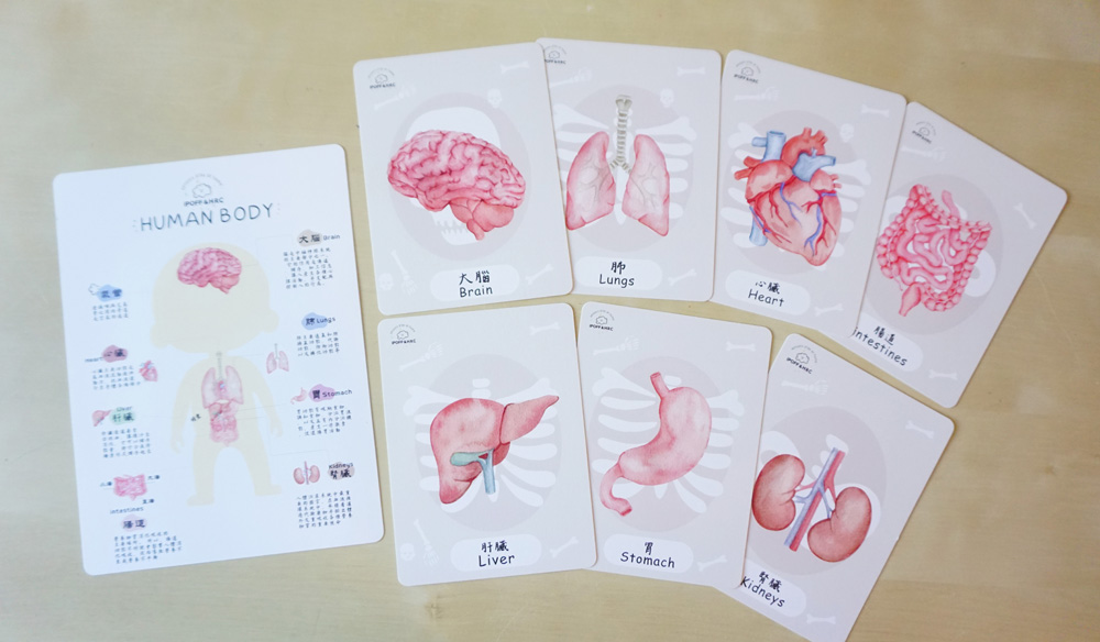 ▼Human Body科普卡片8張,包含一張全身卡片解說,與七張七張卡片小卡。藉由圖卡讓孩子認識器官的形狀、位置與功能,器官的部份還有英文對照,可以一起學英文單字。