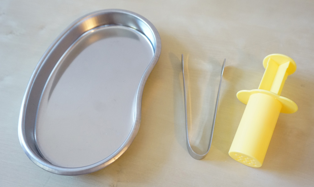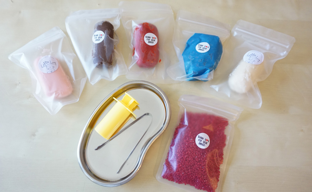 ▼5色黏士(各100g)、不鏽鋼彎盤1個、不鏽鋼鑷子1把、經脈彩泥管、1個紅色彩米50g,這一組工具組非常澎湃,有五色黏土可以讓孩子親手做玩起來,還有仿真的紅色彩米就像是血一般的紅,可愛的彎盤和鑷子,讓孩子當起小小醫生動手做。