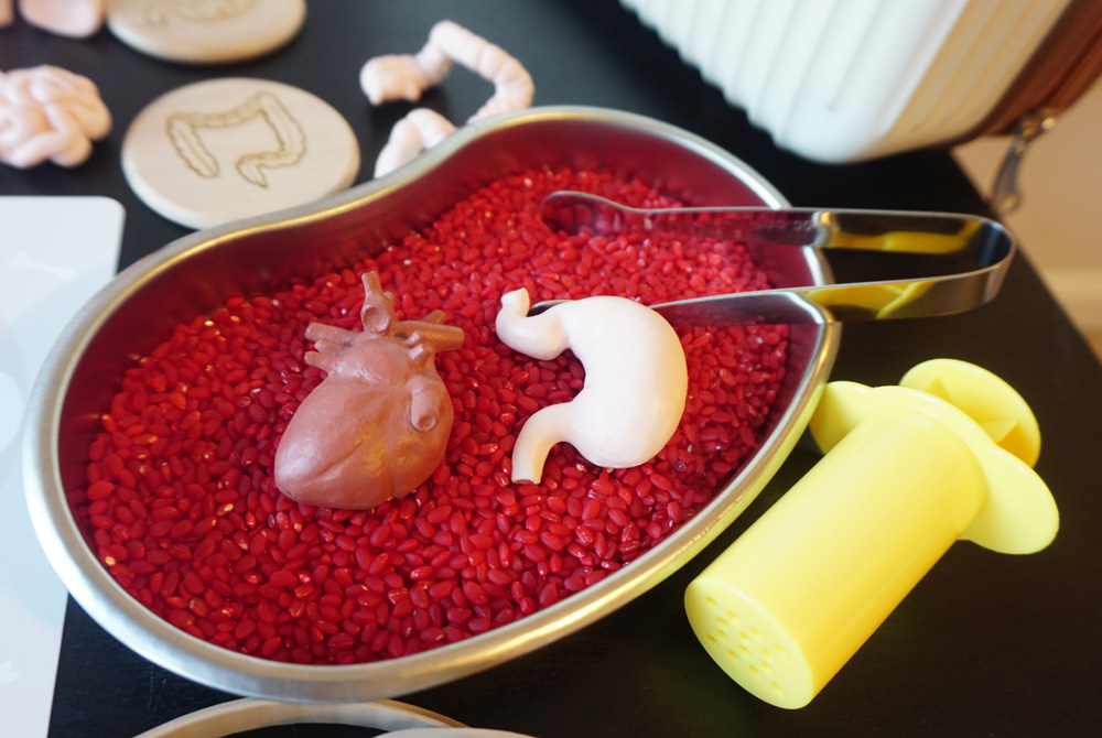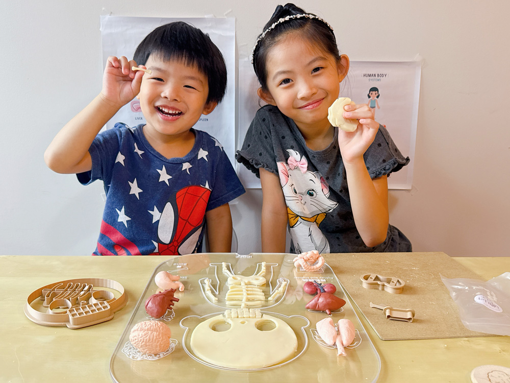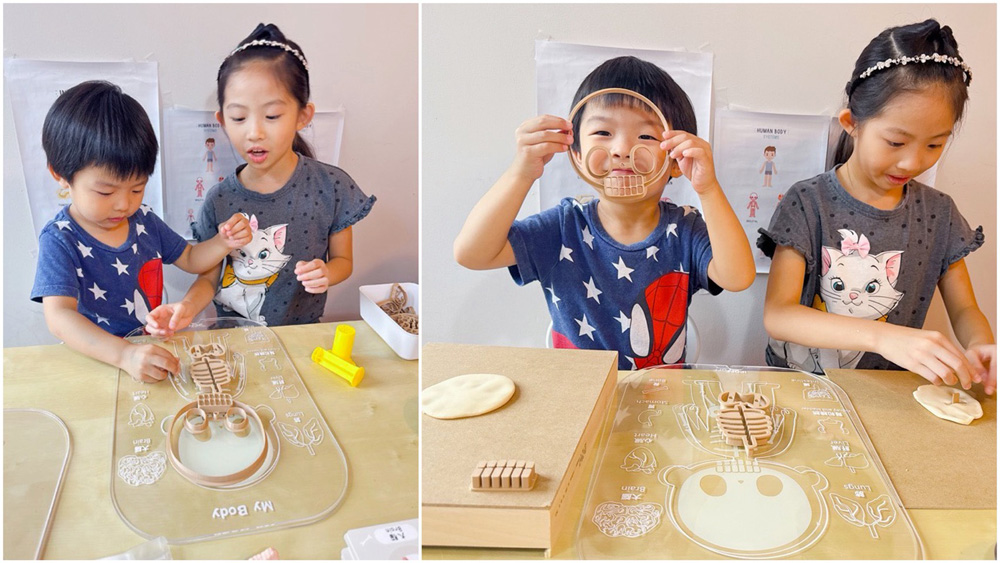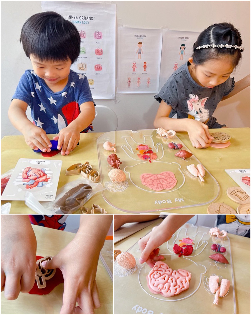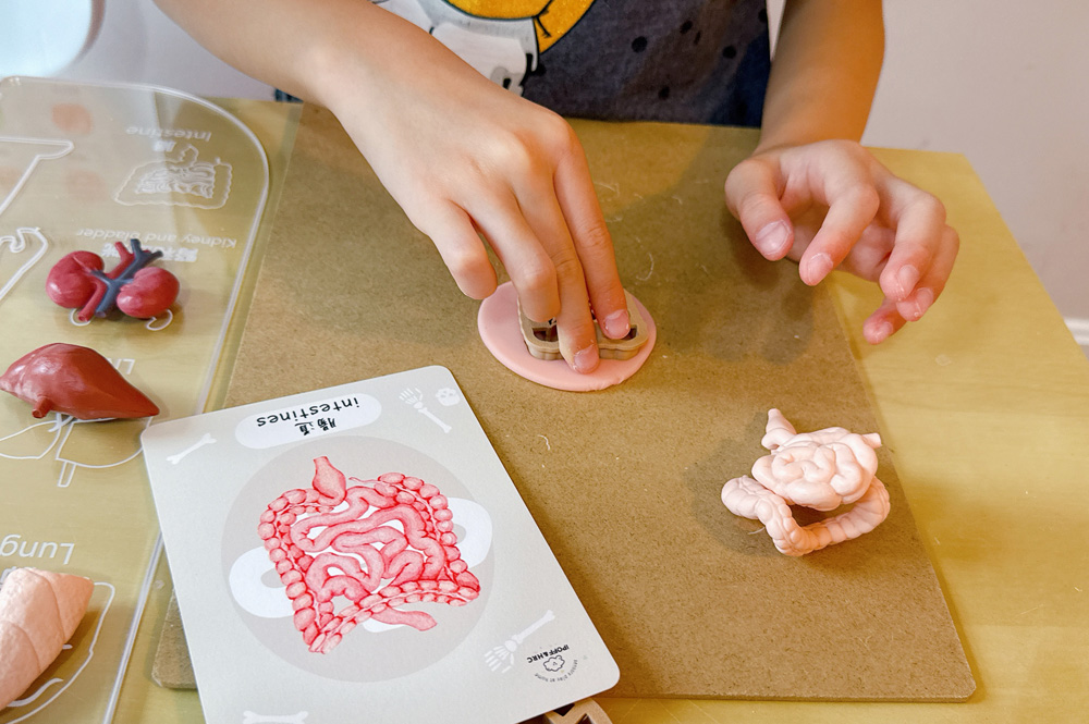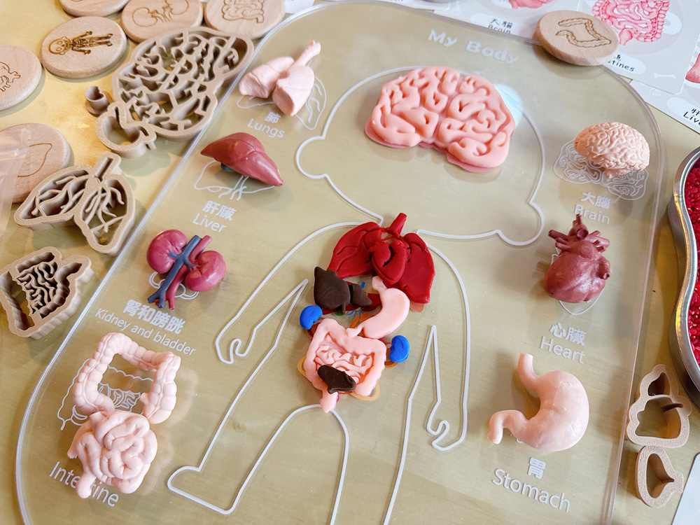 ▼帶孩子了解器官位置與功能,再分配他們將身體造型切模器官的部份取出,搭配不同的顏色黏土,讓孩自動手做出模型。