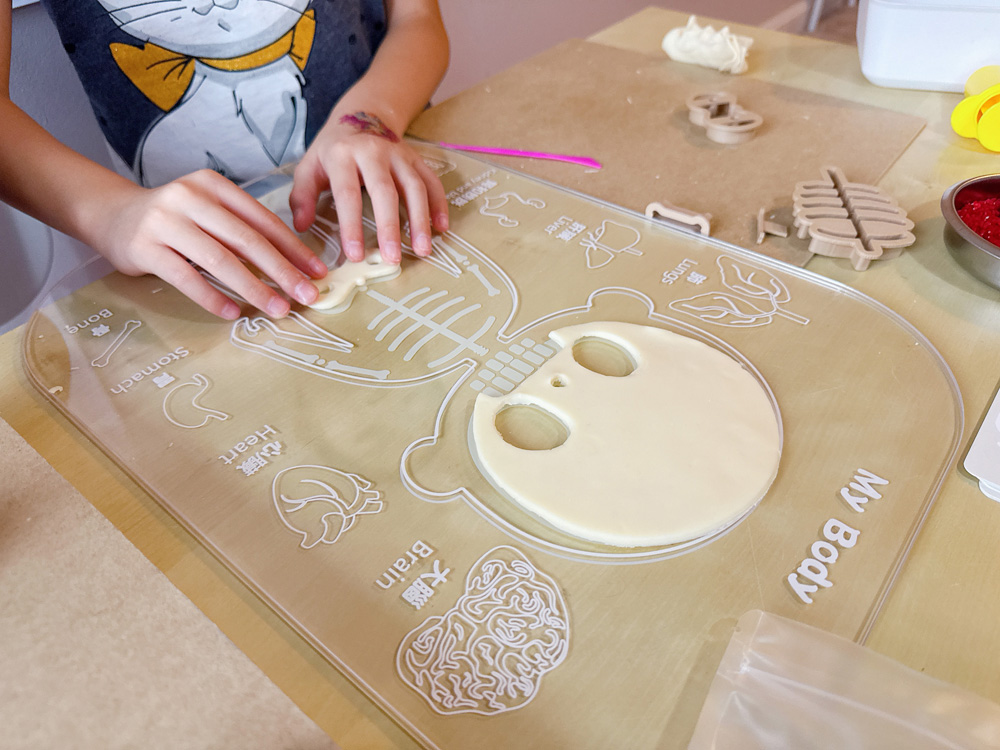 ▼取出白色的黏土,將壓模好的骨骼形狀,再放到骨骼板上,讓孩子認識到全體骨骼的組成。