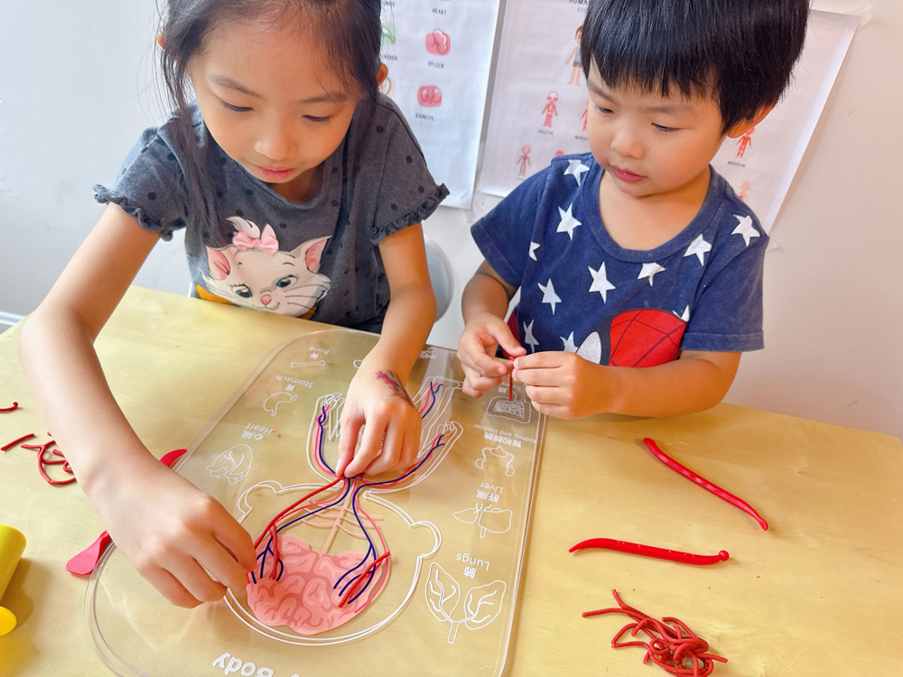▼再來玩經脈板子,我們使用彩泥管加入藍色、紅色黏土,製作出一條一條的動脈與靜脈,孩子們超可愛都覺得是在製作麵條,這環節好有趣。